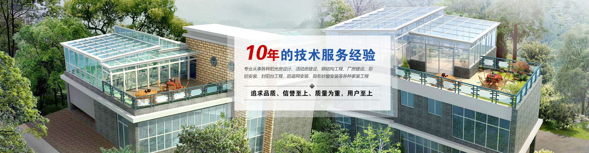 鄭州如意陽(yáng)光房有限公司官網(wǎng)成立于2008年,是一家從事各種陽(yáng)光房設(shè)計(jì)、活動(dòng)房建設(shè)、鋼結(jié)構(gòu)工程、廠房建設(shè)、彩鋁安裝、封陽(yáng)臺(tái)工程、防盜網(wǎng)安裝、隱形紗窗安裝等各種家裝工程的公司。雖然我們公司成立時(shí)間不是特別長(zhǎng),但是我們憑借我們精湛的工程制作技巧服務(wù)理念,給客戶留下了深刻的印象和好評(píng)。鄭州如意陽(yáng)光房有限公司官網(wǎng)———鄭州陽(yáng)光房、鄭州活動(dòng)房和鄭州鋼結(jié)構(gòu)安裝公司!鄭州如意陽(yáng)光房有限公司官網(wǎng)擁有一批技術(shù)素質(zhì)優(yōu)良的安裝隊(duì)伍,并且安裝工程所用到的設(shè)備都是好的玻璃,鋼材,鋁合金型材,配置好的五金件組成的,讓用戶一眼就滿意![查看詳情]